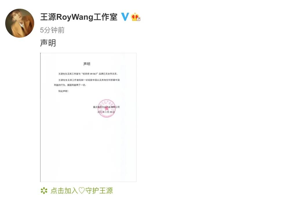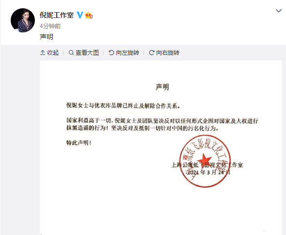 3月25日下午,倪妮、井柏然、王源工作室先后发声明,宣布终止与优衣库品牌的合作。