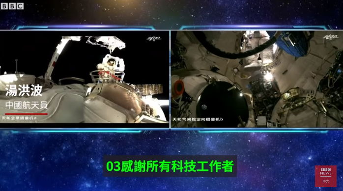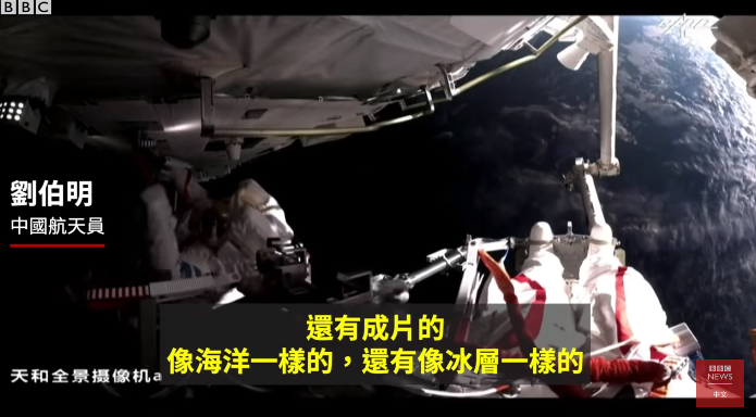 视频显示,BBC中文网还在画面中使用了航天员出舱时讲话的原声。↓