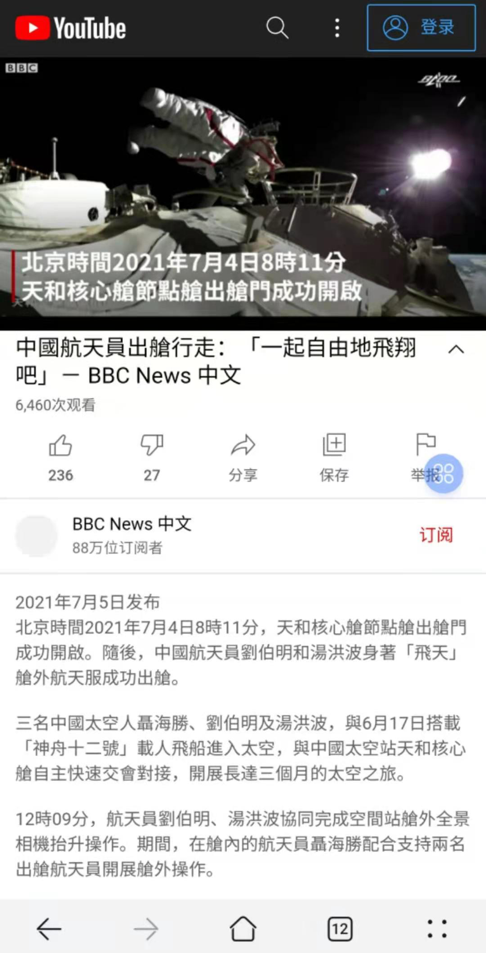 BBC中文网Youtube页面显示,BBC中文网在此次视频报道中援引中央电视台相关画面,并以航天员刘伯明的一声“哇,这外面太漂亮了”开启此次时长1分42秒的报道。