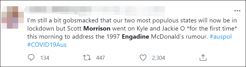 “数以百万的澳大利亚人困于贫困,封锁,还不知道能不能付得起房租,莫里森却跑到电台节目里讨论他24年前到底有没有拉裤子。”