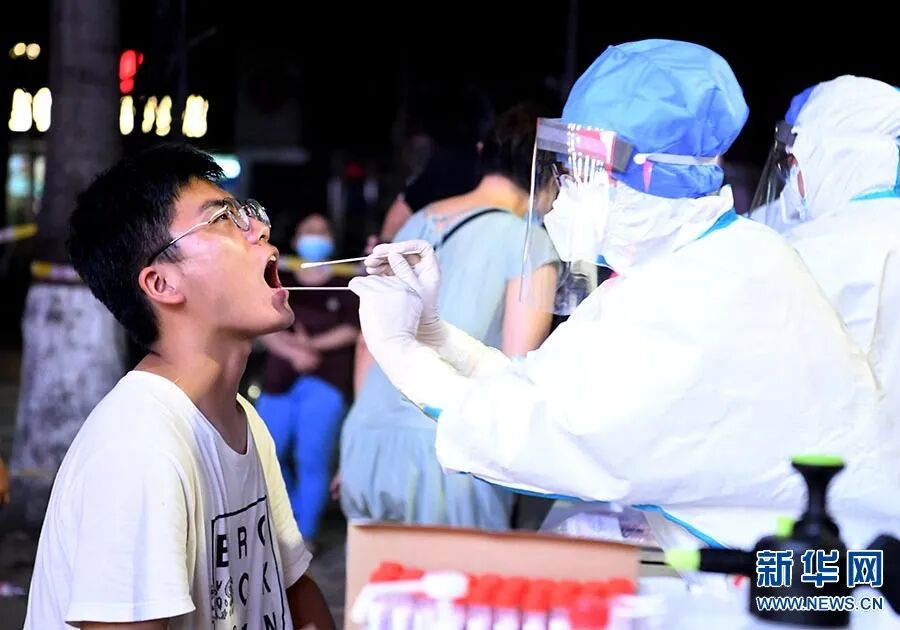 7月31日,在郑州市二七区淮河路街道淮河社区核酸检测点,工作人员对市民进行核酸检测取样。
