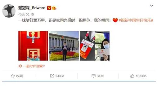 对于欧阳娜娜等人今日发文祝福祖国繁荣昌盛、祝新中国生日快乐,不少大陆网友为他们点赞:真棒!↓