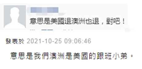 “意思是美国退澳大利亚也退,对吧!”“意思是澳大利亚是美国的跟班小弟。”有网友说。