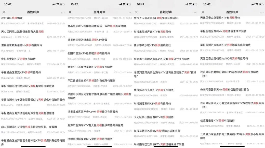 这些举报,涉及湖南株洲、益阳、永州、岳阳、常德、湘潭、衡阳等地的市县区KTV。各地网友在举报中,痛斥相关KTV藏污纳垢,“男模有偿陪侍”横行,破坏家庭、败坏社会风气,有的还提供陪睡等性交易行为,有的高价销售假酒。