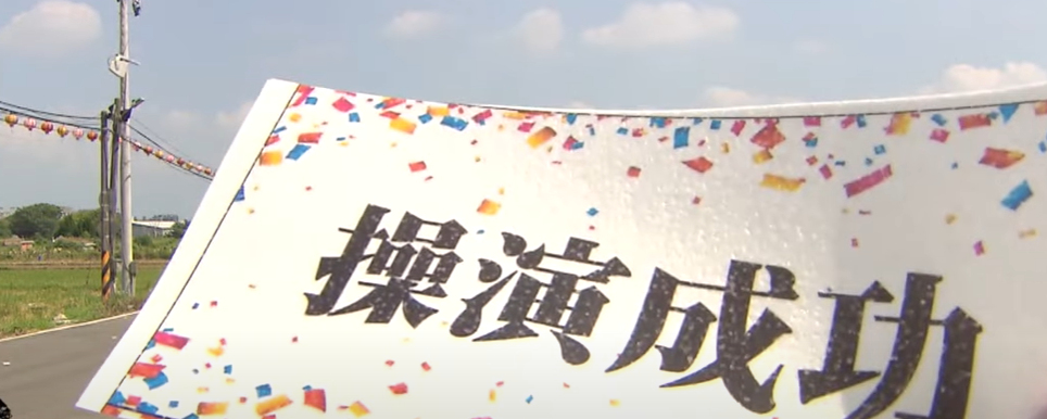 下一个镜头,台军“二代心战作业车”配备的摇控无人机亮相。只见这架最多可装500张传单的无人机摇摇晃晃地飞到了距离地面不远的位置,缓缓地开始抛小纸条,纸条上写着“操演成功”。