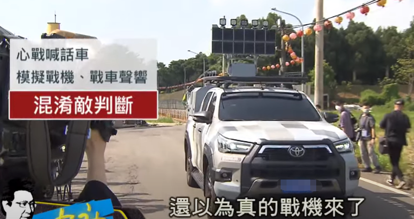 视频中,一辆漆有“城市迷彩”的台军“心战”喊话车一边行驶,一边播放着模拟战机驶过的录音。台媒称这能“迷惑敌军”,“让不少附近民众吓一跳,还以为真的战机来了”。
