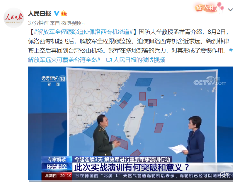 国防大学教授孟祥青介绍,8月2日,佩洛西专机起飞后,解放军全程跟踪监控,迫使佩洛西专机舍近求远,绕到菲律宾上空后再回到台湾松山机场。我军在多地部署的兵力,对其形成了震慑作用。