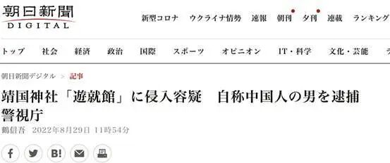 日媒声称一男子闯入靖国神社游就馆后被移交警方,“自称是中国籍”