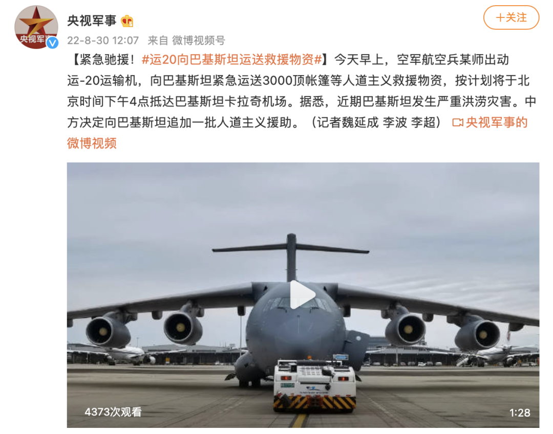 今天早上,空军航空兵某师出动运-20运输机,向巴基斯坦紧急运送3000顶帐篷等人道主义救援物资,按计划将于北京时间下午4点抵达巴基斯坦卡拉奇机场。据悉,近期巴基斯坦发生严重洪涝灾害。中方决定向巴基斯坦追加一批人道主义援助。