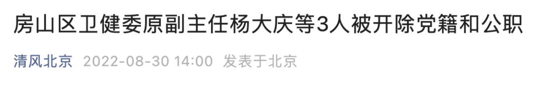 日前,经房山区委批准,房山区纪委监委对区卫健委原副主任杨大庆、医政科原科长晋长皓、医政科原三级主任科员邢曼严重违纪违法问题进行了立案审查调查。
