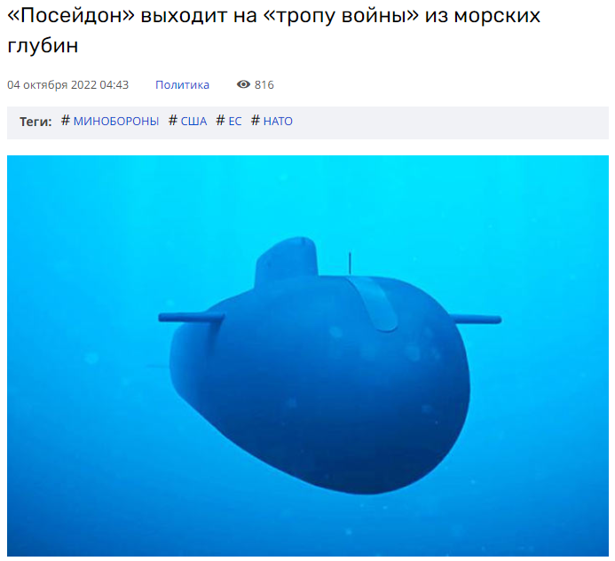 报道还说,波塞冬的深度可达1000米,不可能通过所有现代手段来探测它——无论是在水下,还是在从空中。并且对于这种设备来说,它的速度也不错——任何完美的鱼雷都不会达到此速度。所以它被称为末日武器,因为如果你把它发射出来,它当然可以走很长一段时间,但无疑会击中目标。