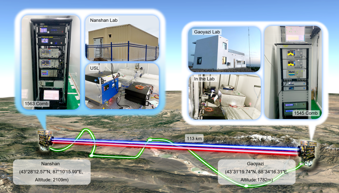 此项研究中,研究团队实现了瓦级功率输出的高稳定光频梳,实现了纳瓦量级的高灵敏度线性光学采样探测,进一步提升了光传输望远镜的稳定性和接收效率。基于上述技术突破,研究团队在新疆乌鲁木齐成功实现了113公里自由空间时频传递,充分验证了星地链路高精度光频标比对的可行性。
