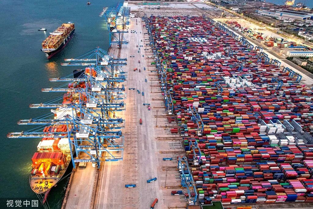 2022年10月5日,青岛港,前湾集装箱码头,各个泊位停靠着正在装卸集装箱的货轮,现场一片忙碌。