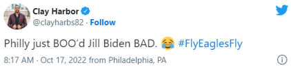 美国职业橄榄球大联盟前球员克莱·哈伯发推称:“费城人刚刚把吉尔·拜登嘘惨了。”