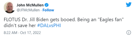体育评论员约翰·麦克马伦发推称:“美国第一夫人吉尔·拜登被嘘。作为一个‘老鹰队粉丝’(的身份)并没有拯救她。”