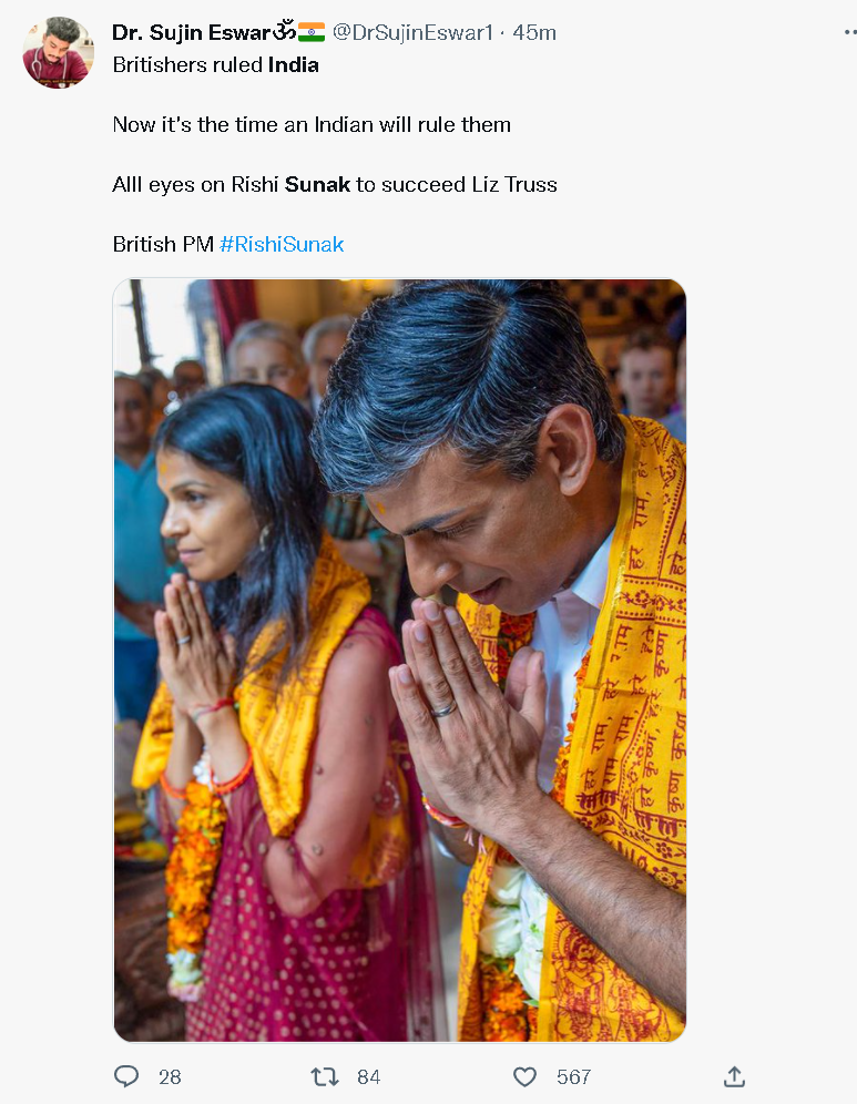 还有一些人表示,尽管苏纳克并不是印度公民,他当选英国首相也并不是印度的胜利,但他确实和印度有着很深的关系,其中除了他印度裔的身份外,他还是全球知名的印度大企业印孚瑟斯(Infosys)的共同创始人纳拉亚纳·穆尔蒂(N.R. Narayana Murthy)的女婿。