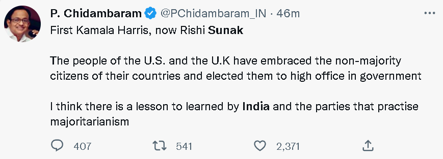 不过,也有一些人希望印度能从苏纳克即将成为英国首相的事情中学到一些事情,比如学会尊重少数群体。印度在野党国大党的支持者表示,苏纳克的经历给不断攻击印度国大党领袖索尼娅·甘地是“外国人”的印度人民党上了一课。公开资料显示,索尼娅·甘地出生在意大利,但在1983年入籍印度时已经自动失去意大利国籍,当时意大利不支持双重国籍。