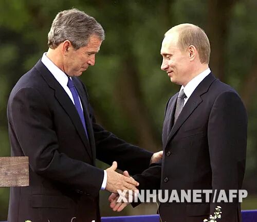 2001年6月16日,俄罗斯总统普京和美国总统布什在斯洛文尼亚首都卢布尔雅那市郊的布尔多城堡举行会晤。这是普京与布什的首次会晤。图自新华社/法新