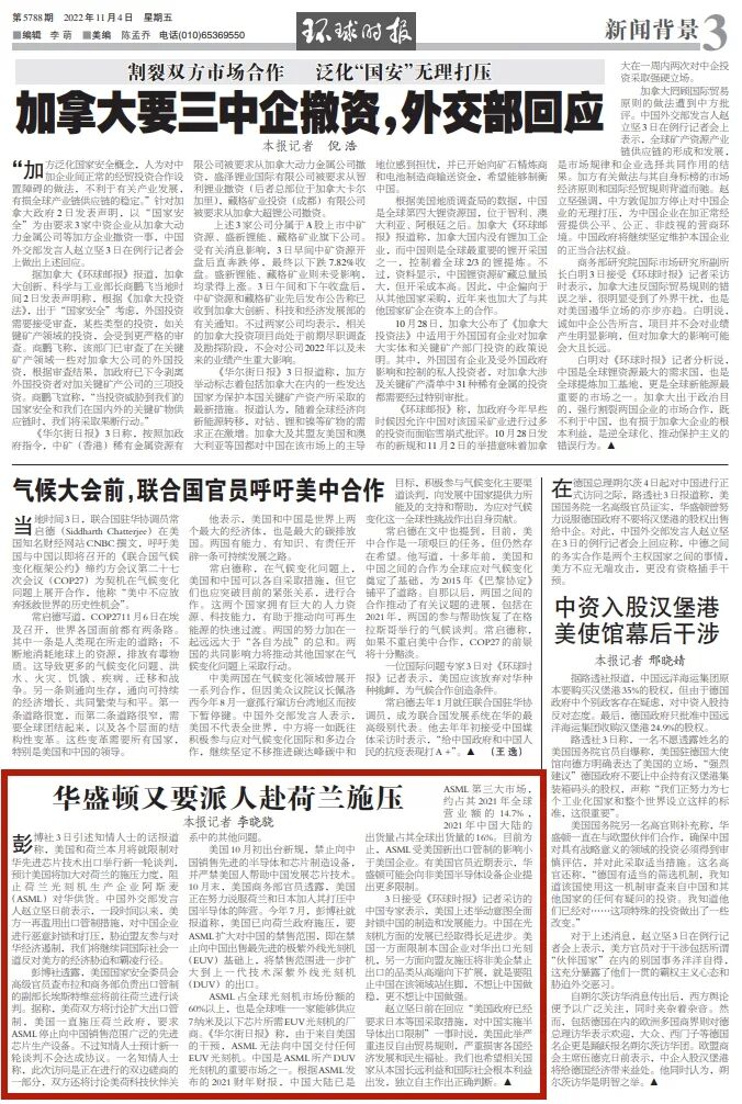 3日接受《环球时报》记者采访的中国专家表示,美国上述举动意图全面封锁中国的制造和发展能力。中国在光刻机方面的发展已经取得长足进步。美国一方面限制本国企业对华出口光刻机,另一方面向盟友施压将非美企禁止出口的品类从高端向下扩展,就是要阻止中国在该领域站住脚,不想让中国做稳,更不想让中国做强。