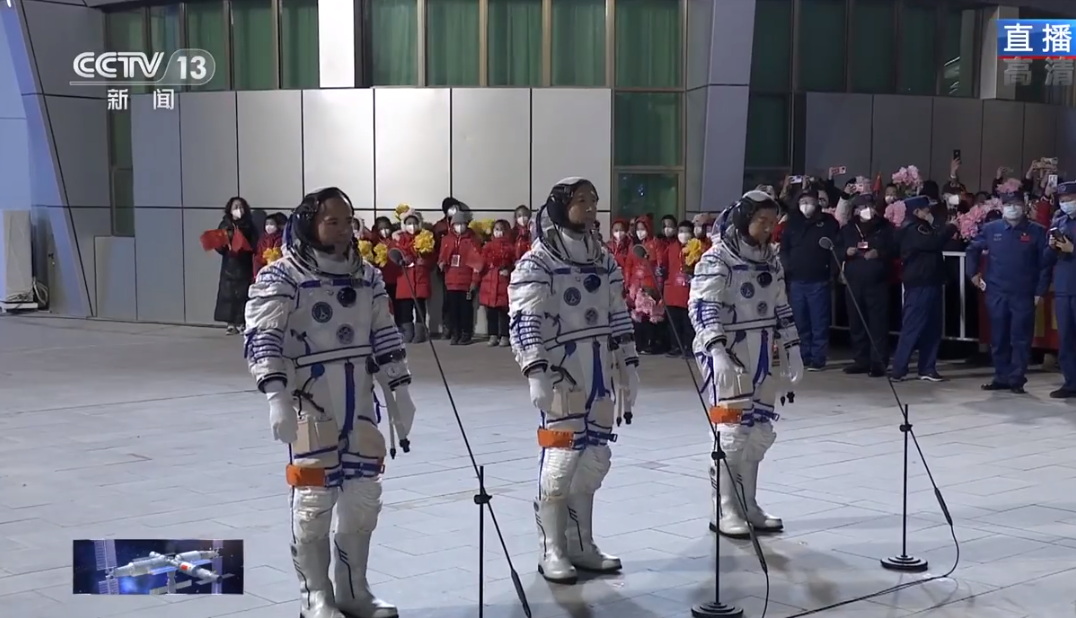 神舟十五号载人飞行任务航天员乘组出征仪式。图源:@央视新闻 视频截图