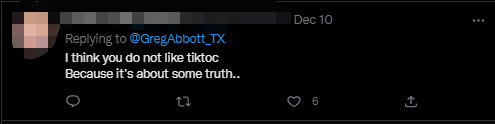 对于美方在州政府层面相继对TikTok发布“禁令”一事,社交媒体上一些网友并不赞同。得克萨斯州州长阿博特本月10日曾在推特发布了一条再次渲染TikTok“威胁”的推文,该推文下方就有网友表示,并发出提醒:“你一定是在开玩笑,你没法尝试提高购买枪支的最低年龄门槛,禁止(使用)TikTok应该是你最后的担忧。”“我认为你不喜欢TikTok,因为它上面有一些真相……”“停止(这样的行为)吧!!!解决真正的问题。”↓
