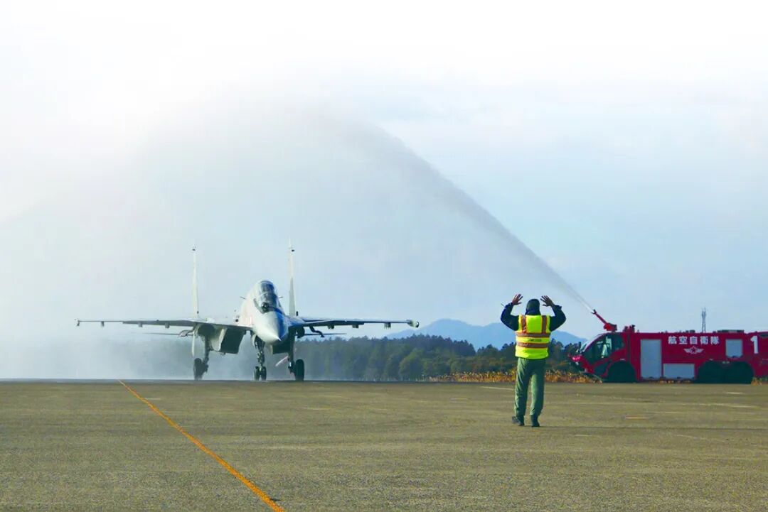 日本自卫队用水门仪式迎接抵达百里基地的印度苏-30MKI战斗机。