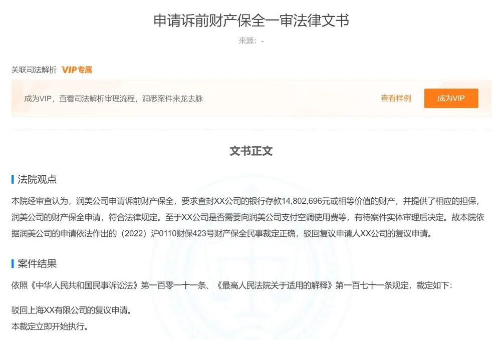 哔哩哔哩公司申请复议,法院审查认为,润美公司的财产保全申请符合法律规定。至于哔哩哔哩公司是否需要向润美公司支付空调使用费等,有待案件实体审理后决定。故此,驳回哔哩哔哩公司的复议申请。
