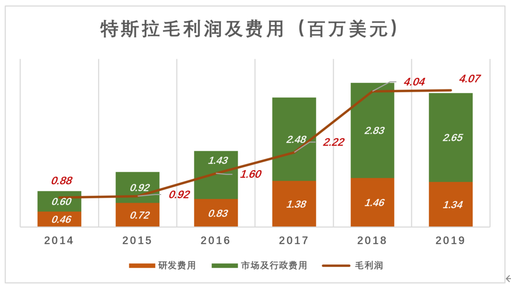 下图暗红色折线代表毛利润,彩色堆叠柱代表“研发费用”和“市场及行政费用”,可以清楚地看到特斯拉业绩拐点发生在2018年~2019年。