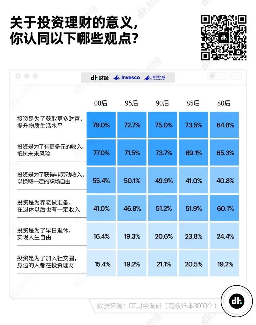 此外,当85后、80后已经为退休和养老考虑投资理财时,00后和95后还更多把投资理财的意义寄托在“换取一定的职场自由”上。调研显示,越年轻越认同投资理财可以获得非劳动收入,以换取一定的职场自由。