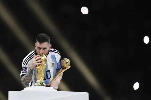 12月18日,获得世界杯金球奖的阿根廷队球员梅西在颁奖仪式上亲吻大力神杯。