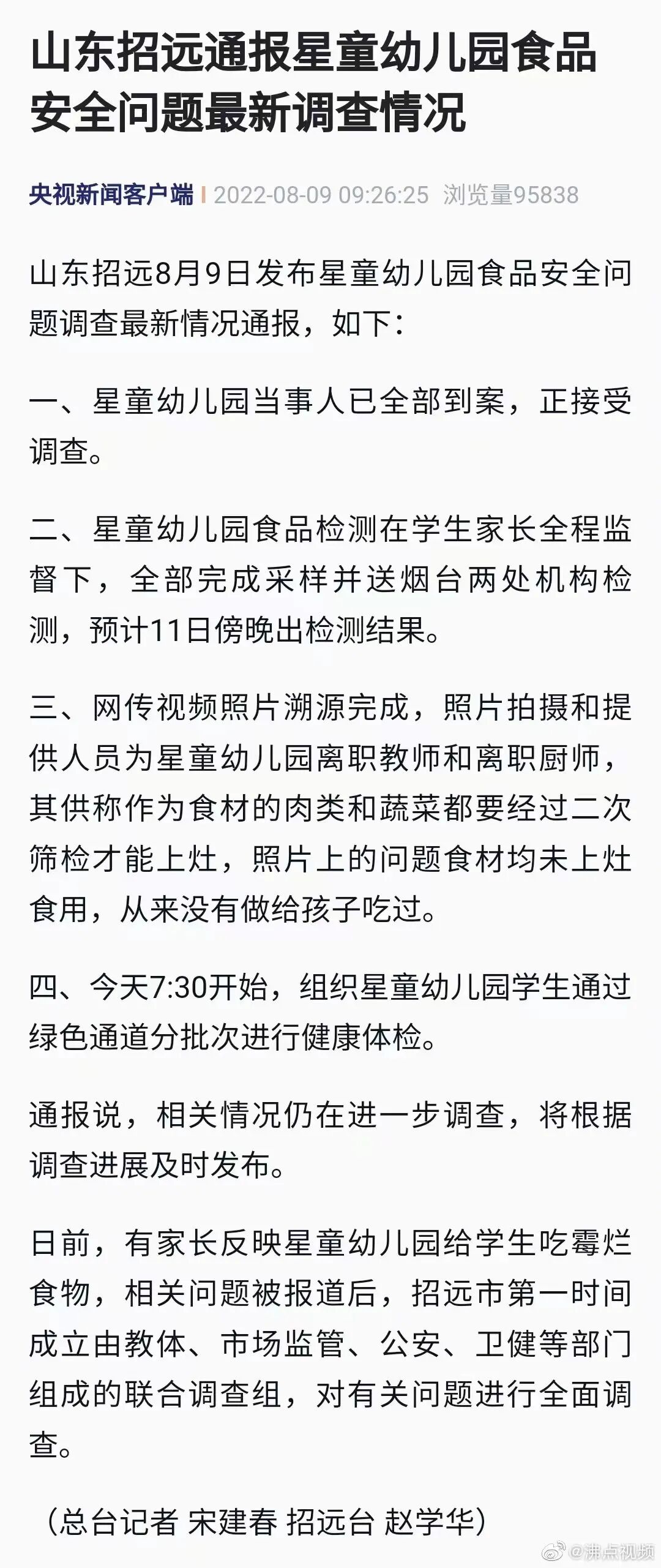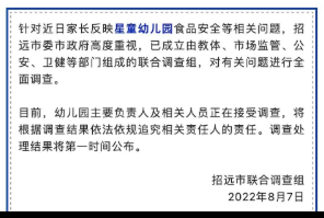 8月9日,山东烟台。招远市再次发布星童幼儿园食品安全问题调查最新情况通报,如下: