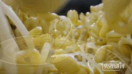影片又借助视觉动作上的相似性,用来自观众其他生活经验的特色音效,构建出一种“间离效果”,如撕毛肚时的“拉链”动效、一颗黄豆滚入石磨中的保龄球动效、切剪洗炸时的各种“武侠片”动效等,这些趣味性的设计,让我们红尘作伴,吃的白白胖胖。