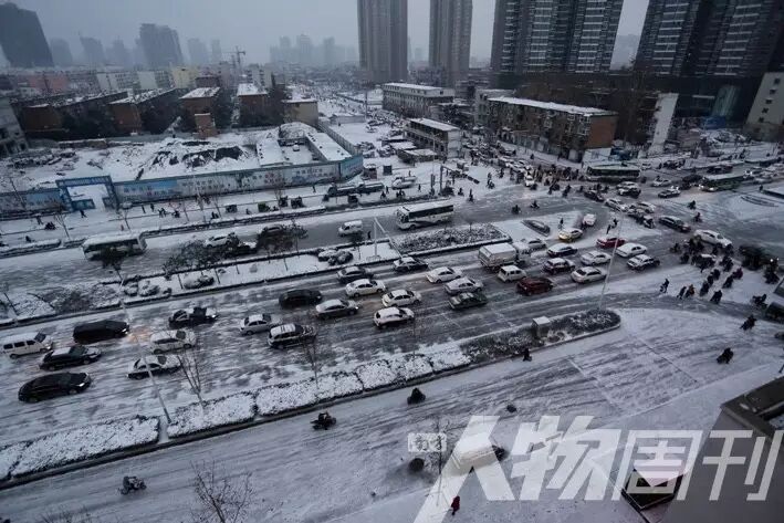 河南南阳,市民在下过雪的街道缓慢骑行,一旁的建筑工地显得格外萧条