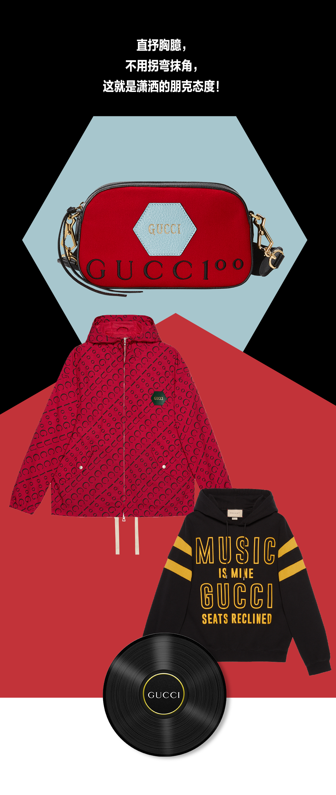 在回溯品牌诞生百年之际,GUCCI 100特别系列作为品牌成立100周年的献礼,整个系列将流行音乐文化的影响融合到GUCCI的时装设计之中,相信大胆先锋且亮眼的设计元素会让大家感到眼前一亮。