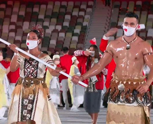 【赤膊旗手又来了!汤加男旗手抹油亮相】