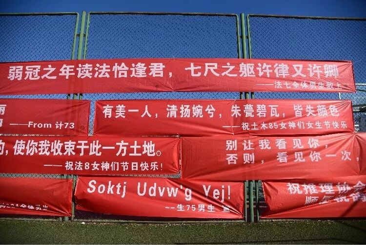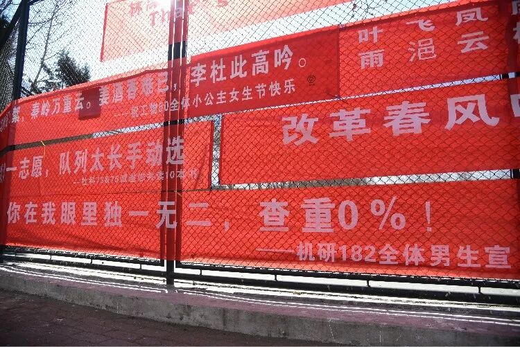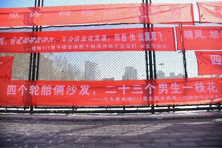又到了三八节,各大高校也到了一年一度张贴祝福的时间了,为此各院系的男生绞尽脑汁大展文采狂飙土味情话,紧跟热点和饭圈话题,今年的条幅祝福依旧“硬核”!