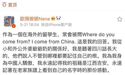 之后,欧阳娜娜本人也转发了工作室声明,并再次强调:当被问到“Where do you come from”时,她都会说“I come from China”。“我为我身为中国人骄傲。我永远记得我的祖籍是江西吉安。”