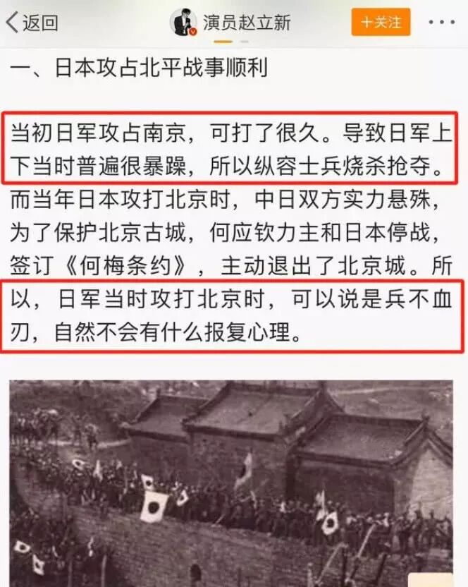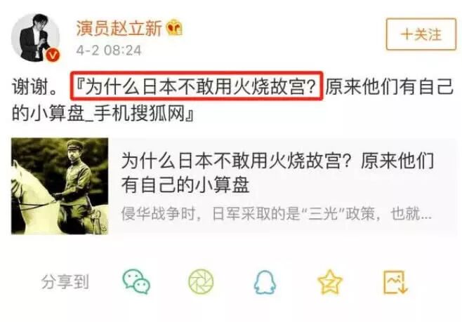 昨天赵立新发了条微博,问:“日本人占领北京八年,为什么没有抢走故宫里的文物?”并与网友在评论区辩论,引发争议。随后又删博进行解释。