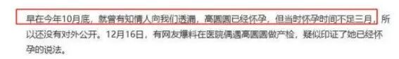 有网友在论坛爆料称高圆圆因为怀孕推掉了某运动品牌的代言活动。此外,还有知情网友称高圆圆的预产期就是在今年7月或8月,按此推测应该是在去年年底怀上。