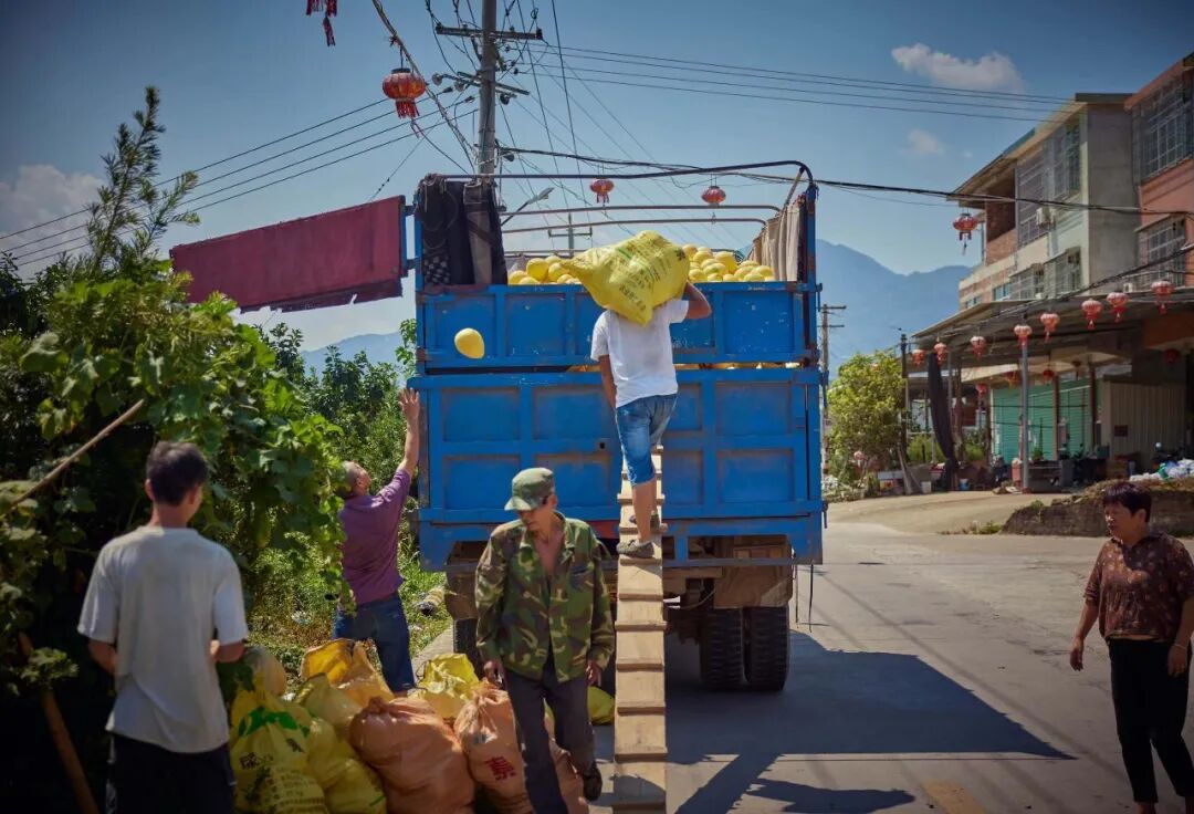 9月、10月是蜜柚集中采摘的季节,整个县城几乎是围绕着柚子运转起来。许多工作岗位也在这最忙碌的两个月衍生出来。本地的货车难以应付几百万吨的柚子,一辆辆大货车从周边县市被租用过来,穿过城里的主干道,驶向各个乡镇的山上。如果柚子长在高山上,山路狭窄,车子只能停在山下,靠人工往下挑——一到秋天,会有许多外省来的工人专门做挑柚子的活计,挑一斤柚子几分钱,一天能挣三五百块,果农还会时不时给工人递一根香烟。平时在家带孩子的妇女,此时也坐进工厂,反复按压包装机的把手,“咔嚓”一声,蜜柚包装袋就密封上了。镇上的蜜柚加工工厂灯火通明,分拣机器的轰隆声一直到后半夜才停息。