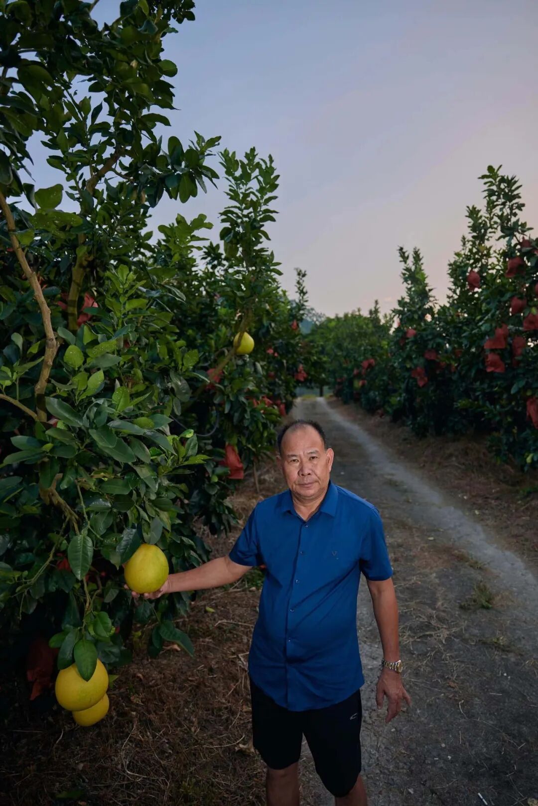 一路向南,出租车沿着山路盘旋半个小时,来到果农赖坤金的柚园。赖坤金年过六十了,晒得黝黑,但看得出身体硬朗。年轻时,他当过兵、开过家具厂、唱过潮剧,从36岁开始种柚子,如今管理着400多亩地、上万棵柚子树,从海拔几十米的山脚一直种到四五百米的山顶。开垦成阶梯式的山林点缀着成片的红色,这是蜜柚外层套着的橘红色袋子,采摘时,工人才会把袋子拆下。这几天,赖坤金一直住在修在山顶最高处的房子里,晚上也不下山——柚子进入成熟季,他要等着收柚子的公司派人来果园查看柚子,定出收购价。这是一个农户最“惊心动魄”的几天,一年的收益如何,全看这一颗颗柚子能否争气。