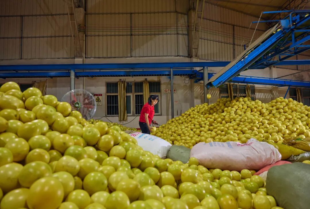 工人们正在包装柚子。到了蜜柚采摘的季节,加工厂里总是灯火通明(黄宇 摄)