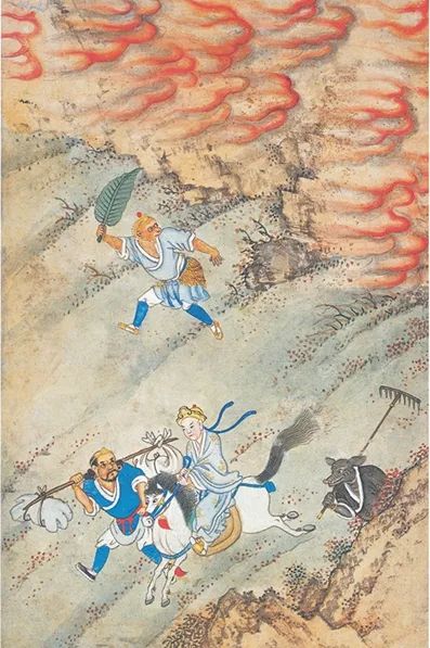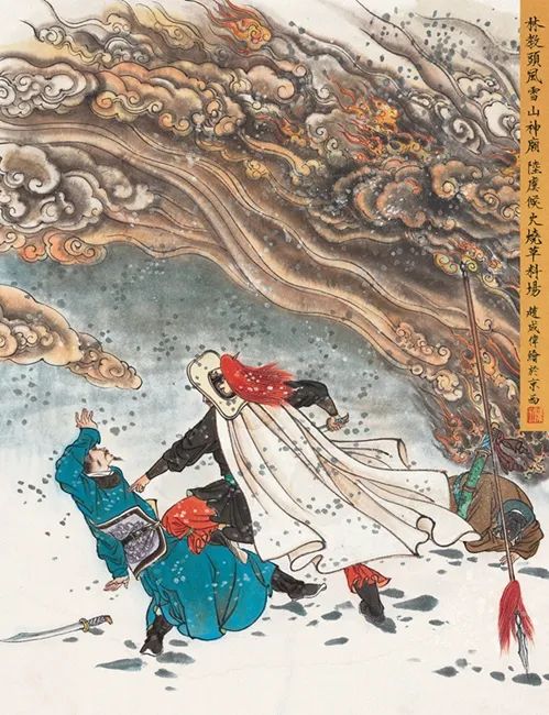 在画中,你能感受到春山、春水、春花,融融春光,清新柔美。“原来姹紫嫣红开遍,似这般都付与断井颓垣……则为你如花美眷,似水流年”。低回浅唱,隐隐有声。大雾垂江,云天暗淡。鼓声喧天,万箭飞来。孔明谈笑自若,酌酒坐谈。“我本是卧龙岗散淡的人”,京剧《空城计》中的唱腔若有若无。雪下得紧,火烧得烈,隐忍的林冲终于爆发出复仇的火焰,那份决绝和杀气穿透纸背而来。大火熊熊,整个画面都翻滚着热浪。看那师徒四人逃得多么狼狈,你不禁会想跑在最后面的悟空此刻定是好生懊恼吧。这些场景,从颜色、构图到人物塑造,都十分严谨细致,清楚到每一帧,精美绝伦,令人震撼!每一幅画也都极具故事张力,当你打开欣赏时,仿佛下一秒就穿越进一场热闹非凡的皮影戏,再下一秒又进入一幅仙气朦胧的山水画。![]()