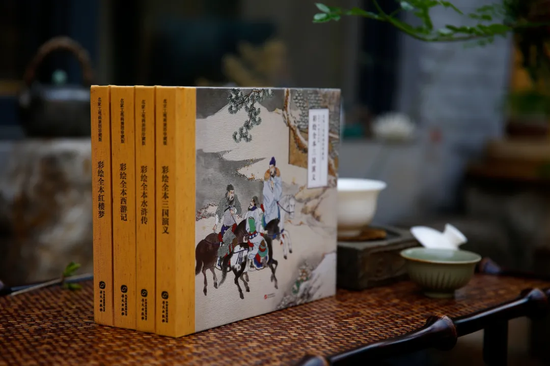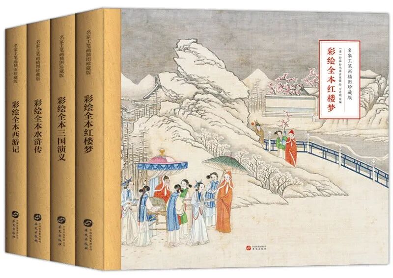 明代大画家陈洪绶在27岁时创作的水浒叶子40幅,陈洪绶的人物画被后世称为“300年来第一人”。他的这套作品影响了后世水浒英雄画工的技法,再难创新。清代画家改琦的红楼梦图咏近50幅,他所创作的仕女形象柔弱削瘦,别具风格,为世人称道。世所罕见,由清代爱新觉罗·盛昱绘制于清同治年间的《红楼梦赋图册》(原稿现藏于爱尔兰Chester Beatty博物馆)。是红学史上第一篇以附体形式评论红楼梦的作品。该画册选取最具代表性的故事情节,可谓是一部小型《红楼梦》。20世纪中国人物画发展史上的里程碑式画家徐燕孙,和连环画大家卜孝怀、墨浪创作的《三国演义》题材的作品。现代中国装饰艺术和中国动漫的奠基人张光宇的西游记系列作品。曾是家喻户晓的动画片《大闹天空》人物形象的设计者,日本动画大师宫崎骏都是他的铁粉。还可以看到当代工笔画领域的佼佼者、画家罗寒蕾历时三年创作的《金陵十二钗》藏在精美手账中,这部被美术评论家认为是“最为写实,最为传神,最能打动人心的一件反映金陵十二钗的作品”,可谓极致惊艳,美彻心扉。同时还收集了对中国20世纪艺术有重要影响的墨西哥画家珂弗罗皮斯,历时3年为英译本《水浒传》绘制的近30幅很有中国风的彩色插图。被后世认为“画出了最传神的《水浒传》”。拥有这样一套四大名著及丰富周边,就如同走进了一座四大名著精品画作的博物馆,令人流连忘返,目不暇接。大开本画册,高品质印刷