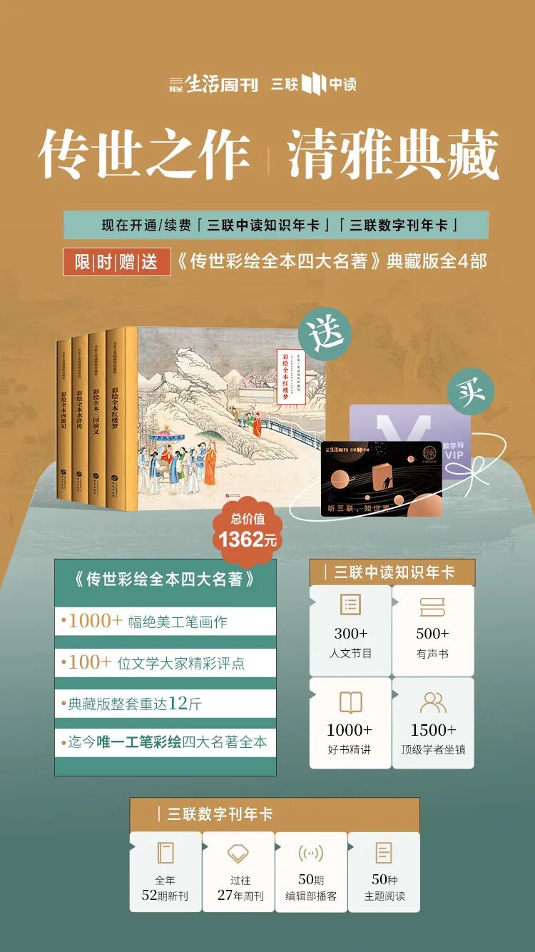 ▼点击【阅读原文】,续费/开通三联「知识年卡」「数字刊年卡」,限时赠送《传世彩绘全本四大名著》共4部!