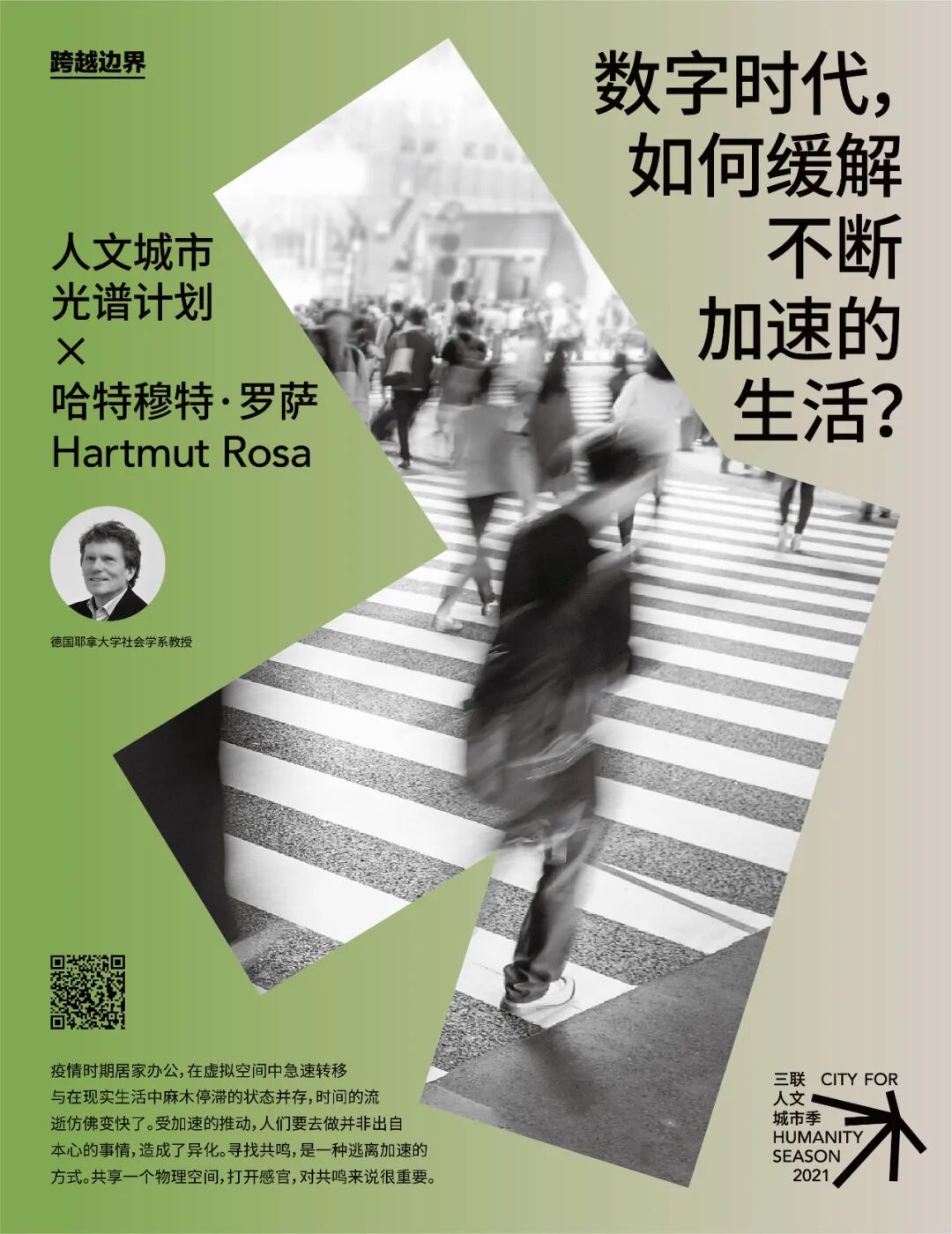 受新冠疫情的影响,居家办公成为日常。我们在数字世界飞快地变换着,几分钟的时间,便能与世界不同国家的人们交谈。但是我们的身体却几乎一动不动地对着电脑屏幕,有时在不知不觉中长达一天之久。这种在虚拟空间中急速转移与在现实生活中麻木停滞的状态并存,让我们觉得时间的流逝仿佛变快了。数字化进程导致的“加速”现象,因为疫情显得更加突出,也引起了德国耶拿大学社会学系教授哈特穆特·罗萨(Hartmut Rosa)的注意。