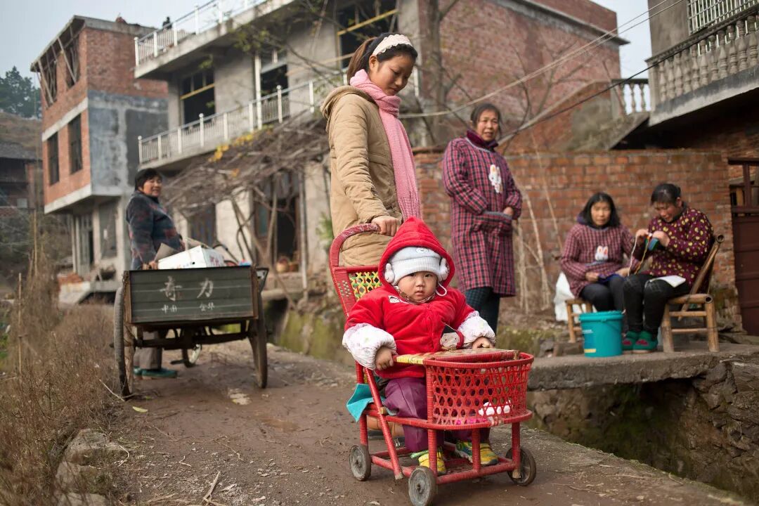 2012 年12月12日,江西省上饶市,一位年轻的母亲推着儿子的小童车。上饶市附近的村庄很多家庭都有多个孩子(视觉中国 供图)