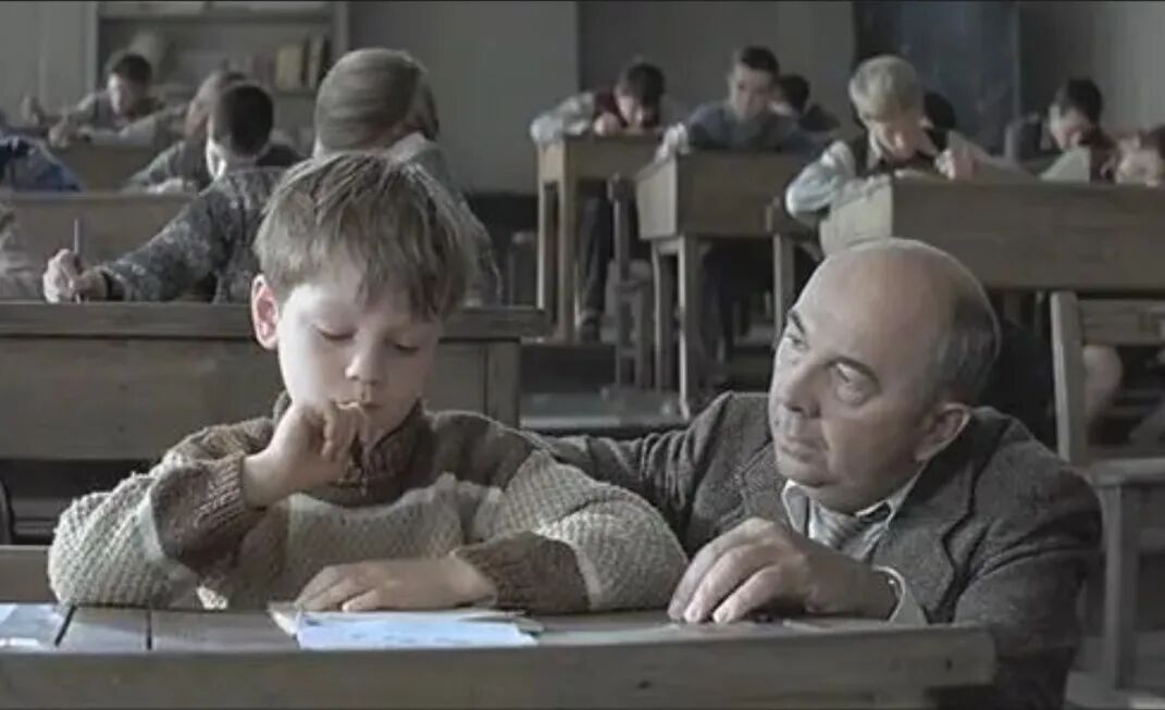 等我看完这几条注释,弄明白斯蒂芬的心理活动之后,接下来的对话很简单。“萨金特用长长的、影影绰绰的笔画抄写着数字,一边不断期待得到指点,一边忠实地描画那些变化多端而又毫无规则的符号,晦暗的皮肤下隐隐闪现着一丝愧色。”我拿着圆珠笔读到这段的时候,忽然觉得很好笑,老师斯蒂芬的心理活动很复杂,每个念头后面都跟着两位哲学家,但学生萨金特非常愚笨,接下来还是斯蒂芬的内心:“母亲之爱。主生格和宾生格。她用自己虚弱的血液和清淡发酸的奶汁喂养了他,把他的襁褓藏在别人看不见的地方。”教师斯蒂芬打量着学生萨金特,内心继续活动着:“我以前像他,也是这么消瘦的肩膀,这么粗俗不起眼。在我旁边弯着腰的正是我的童年。太遥远了,想用手摸摸或轻轻碰一下都够不着了。我的是远了,而他的呢。像我们的眼睛那样神秘莫测。在我们两人心灵的黑暗宫殿里,都盘踞着沉默、冷硬如石的秘密。这些秘密已经厌倦了自己的专横:情愿被赶下台去的暴君。”《放牛班的春天》剧照
