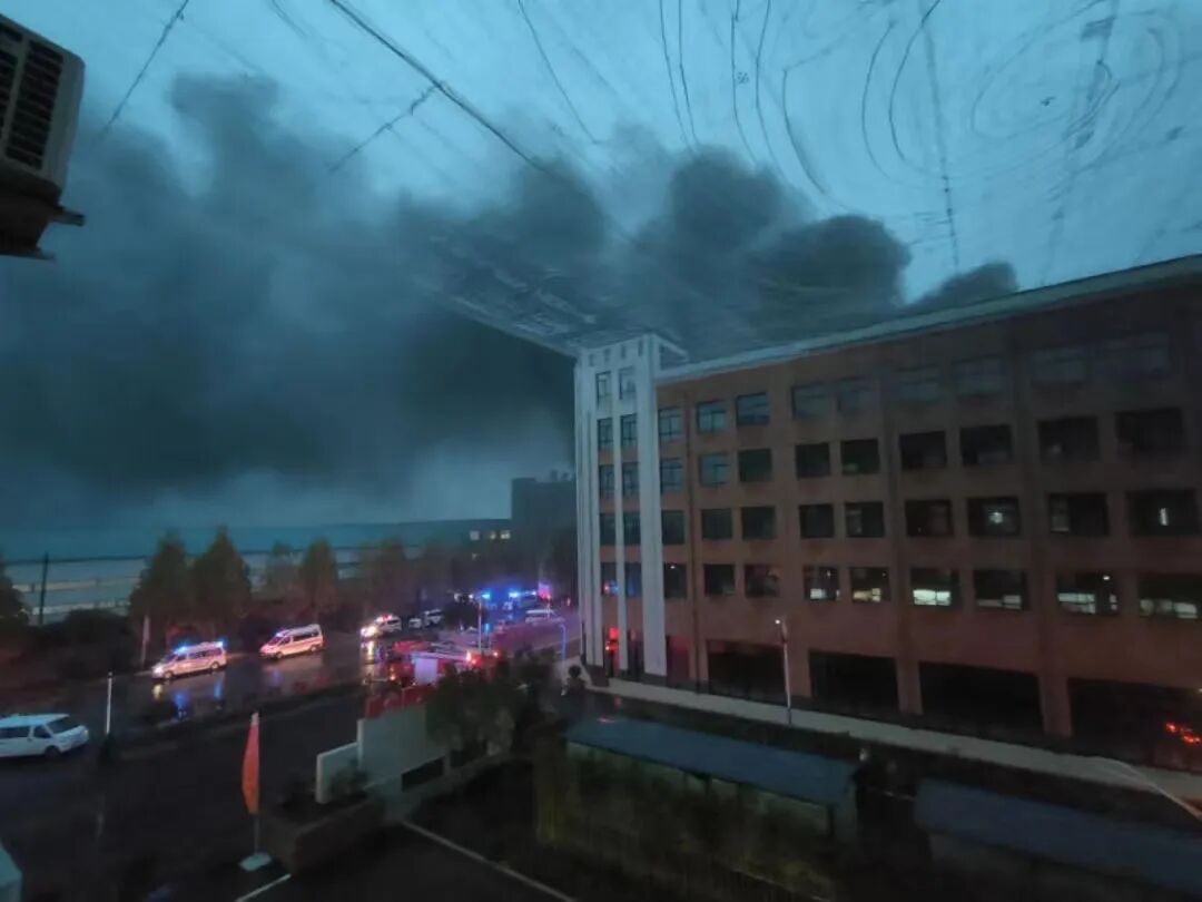 于失火厂房东侧的易商谷园区拍到的现场照片