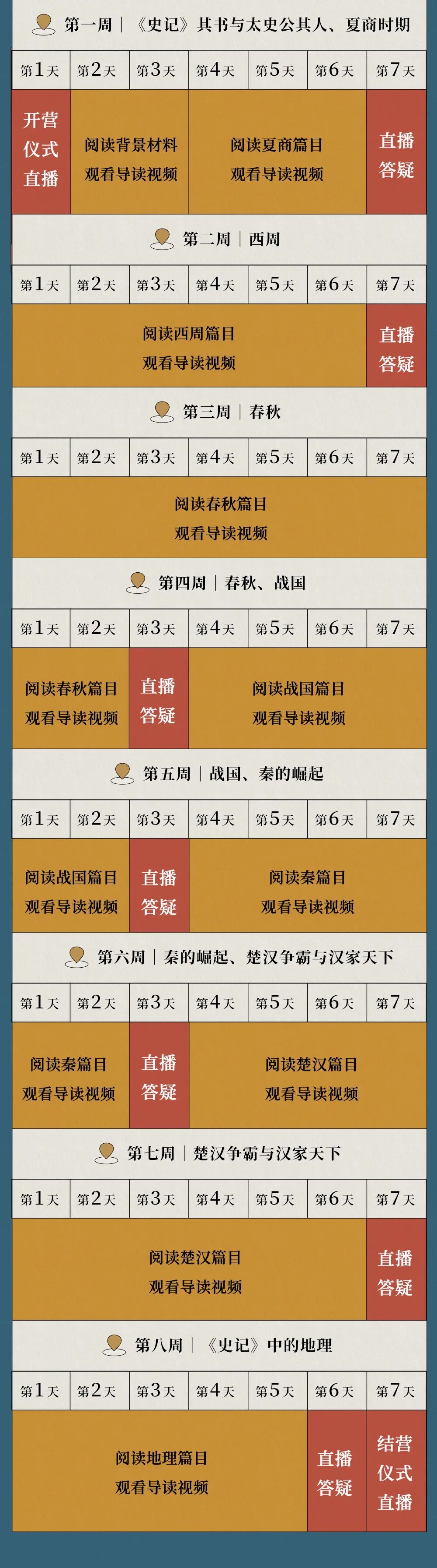 不同于市面上常见的从文学名著角度切入,我们打算用整整8周的时间,从常被忽略的“夏、商、周本纪”出发,还补充了有关中国山川地理的记述,从“时间+空间”双重维度上解读《史记》。